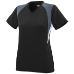 92% polyester/ 8% wicking pinhole mesh * Wicks moisture away from the body * Ladies' fit * Self-fabric V-neck collar